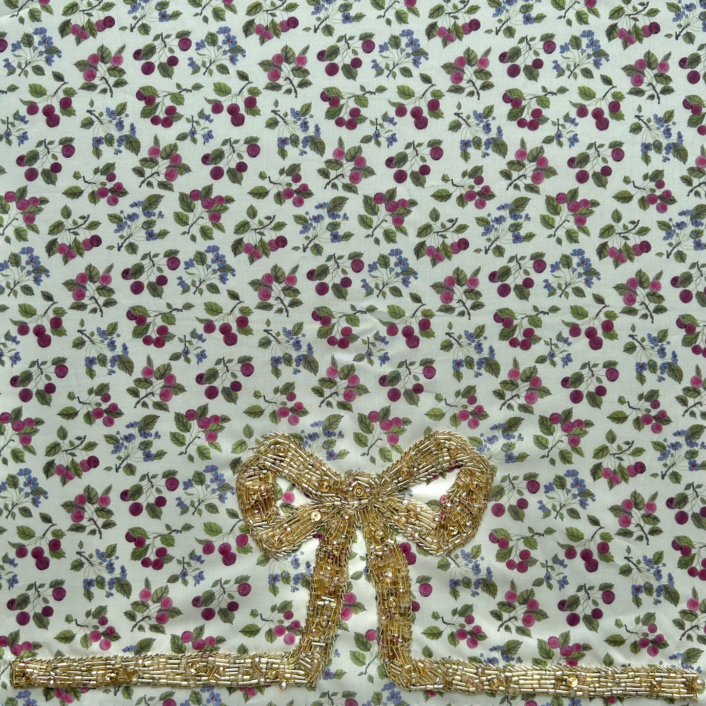 Hand embroidered with glass beads and premium Austrian crystals. Gold tone embroidery.
